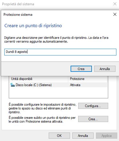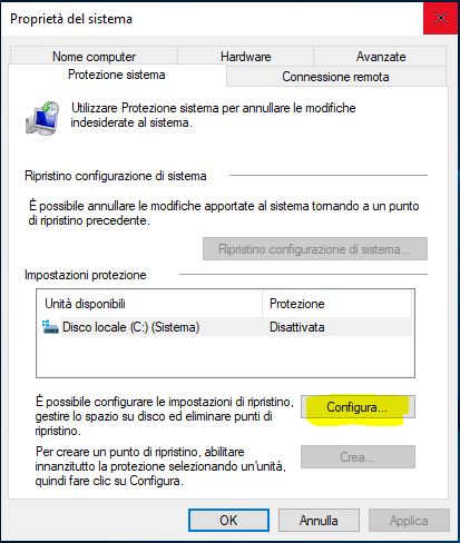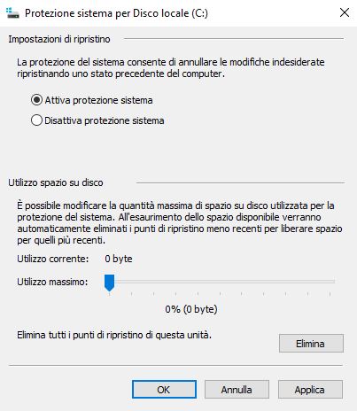 Qui Attiva protezione sistema che di solito è disattivata, Applica e salva le modifiche confermando con OK.