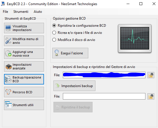 Per effettuare il backup in un momento successivo dovrai andare nella scheda Backup/riparazione BCD e clicca su Impostazioni backup selezionando anche la cartella dove vuoi conservare, la stessa procedura dovrai effettuare per ripristinare ma questa volta cliccando su Ripristina il backup e selezionando la cartella dove sta il file.bcd
