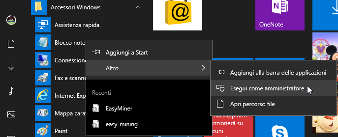 Nel menu Start, vai Accessori Windows e clicca con il tasto destro su Blocco note e poi ancora su Altro – Esegui come amministratore. Naturalmente puoi cercare anche con Cortana ma in questo caso l’opzione Esegui come amministratore ti fa vedere subito.