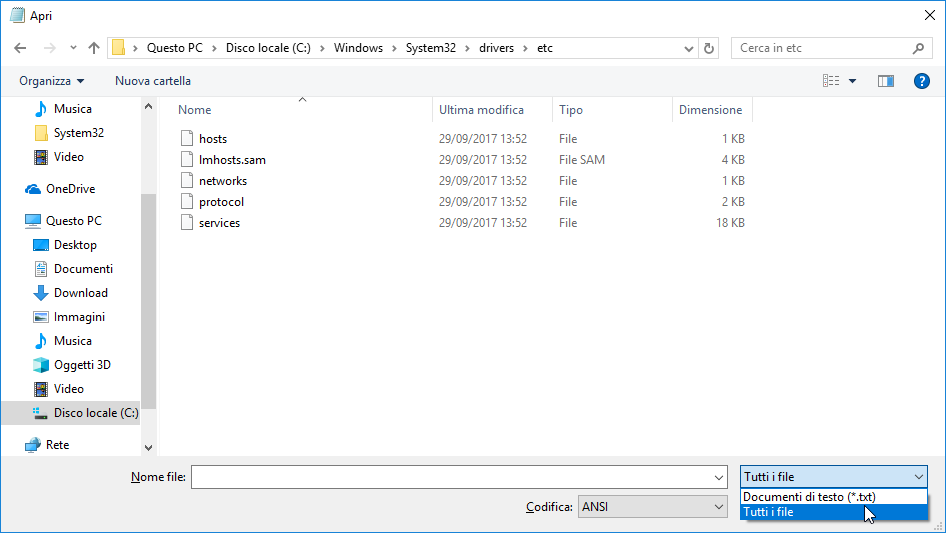 Con il Blocco note aperto vai in File – Apri (o tasti veloci Ctrl+F12) e segui il percorso C:\Windows\System32\drivers\etc. Qui non dovresti vedere nulla, per far comparire il file Hosts devi cliccare su Tutti i file come si vede nell’immagine.
