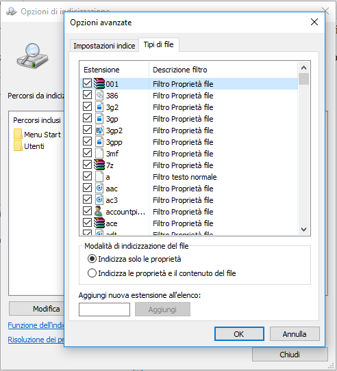 Windows 10 per impostazione predefinita indicizza oltre 500 tipi di file sul PC. Ciò significa che quando cerchi un tipo di formato, nei risultati di ricerca mostrerà tutti i file con quella estensione. Solo i file crittografati non sono indicizzati, ma se vuoi lo puoi far indicizzare.