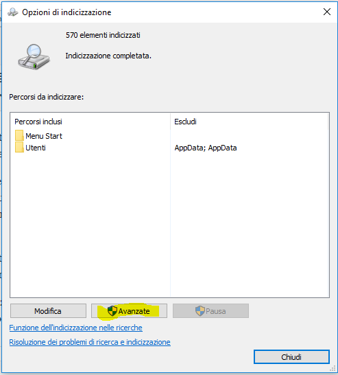 In Cortana cerca Opzioni di indicizzazione e poi clicca su Invio o lo puoi aprire anche dal Pannello di controllo impostando la Visualizzazione per: Icone piccole e successivamente individuando Opzioni di indicizzazione.