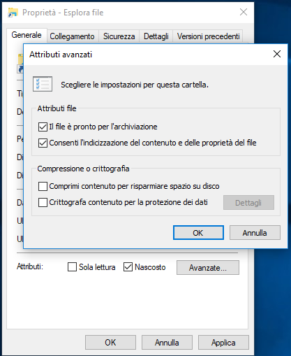 Invece è più difficile che qualcuno si metta ad attivare indicizzazione di certi tipi di file e ora in Windows 10 dalla finestra Proprietà del file o cartelle hai la possibilità di escludere dall’indicizzazione, in questo modo diventerà veramente impossibile cercare da parte delle persone troppo curiose. Detto questo vediamo come si fa.