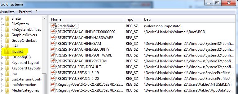 HKEY_LOCAL_MACHINE\System\CurrentControlSet\Control\HiveList
