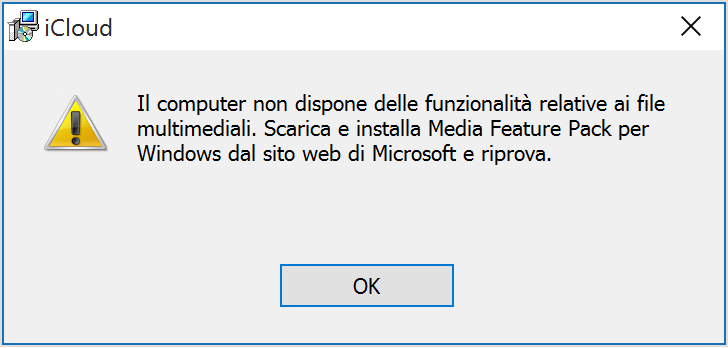 Durante l’installazione di iCloud su Windows, potrebbe verificarsi un problema e comparire una piccola finestra con il messaggio di errore “Il computer non dispone delle funzionalità relative ai file multimediali. Scarica e installa Media Feature Pack per Windows dal sito web di Microsoft e riprova.” Come si può capire, è la mancanza di Media Feature Pack che non permette di completare l’installazione di iCloud. In questa guida vedremo tutte le soluzioni per risolvere il problema e riuscire ad installare iCloud per effettuare il backup del tuo iPhone in Windows.