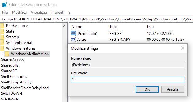 Se nel campo Dati valore c’è scritto 12.0.17692.1004 (ultimi numeri potrebbero anche variare), indicare la versione di Windows Media Player che hai attualmente. Per sicurezza è meglio annotarlo e se cambiando in 1 continua a restituirti l’errore, fai tornare tutto come in precedenza.