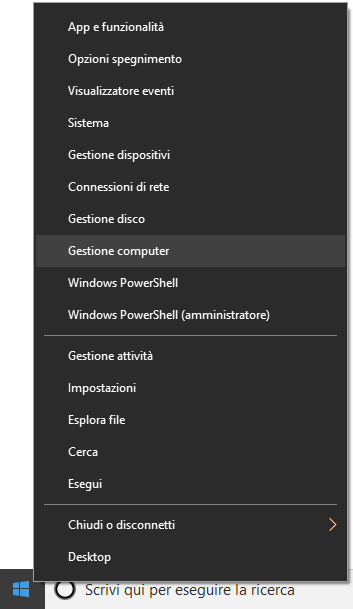 - Con il tasto destro sopra Start e poi su Gestione Computer (tasti veloci WIN+X).