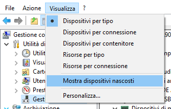 2. Qui prima di procedere devi attivare i dispositivi nascosti e lo puoi fare andando in Visualizza – Mostra dispositivi nascosti.