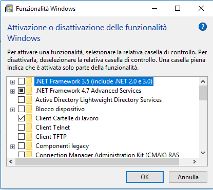 Se non vuoi o non sei capace di utilizzare PowerShell, puoi utilizzare un interfaccia più famigliare per abilitare o disabilitare. Nel Menu Start digita optionalfeatures, ti aprirà una finestra con tutte le funzionalità, per abilitare/disabilitare seleziona la voce che ti interessa e conferma cliccando su OK.
