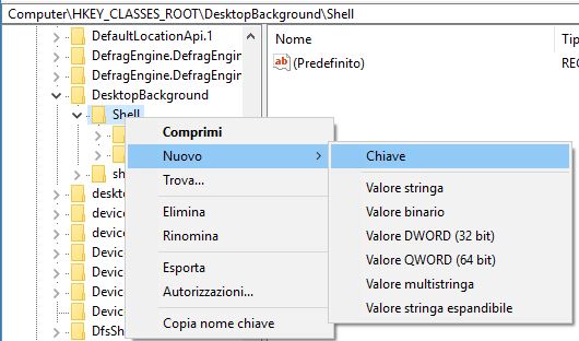 - Apri Registro di sistema premendo i tasti Win+R e digitando regedit. Successivamente vai nel percorso: HKEY_CLASSES_ROOT\DesktopBackground\Shell